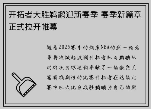 随着2025赛季的到来,NBA的新一轮竞争再次掀起波澜,开拓者队与鹈鹕队的对决为球迷们奉献了一场激烈且富有戏剧性的比赛。开拓者在这场比赛中以大比分战胜鹈鹕,为自己的新赛季拉开了完美的序幕。这场胜利不仅为球队注入了信心,也标志着开拓者在新赛季中展现出的强大潜力。本文将从多个方面详细分析这场比赛的重要性,并探讨其对开拓者未来赛季的意义。首先,我们将从开拓者的整体表现和战术体系谈起,然后分析球队的核心球员如何在关键时刻扭转局势,接着探讨鹈鹕队在比赛中的不足与改进空间,最后总结比赛胜利对开拓者赛季的长远影响。